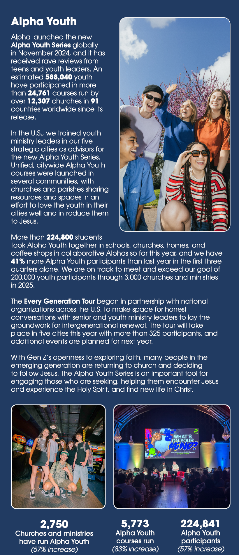Alpha began at a church called Holy Trinity Brompton (HTB) in London in 1977. In 1990 Nicky Gumbel repositioned Alpha as a course for those outside the Church. The number of people attending Alpha at HTB grew quickly into the hundreds and attracted the attention of other churches across denominations seeking to find an effective tool for evangelism. This led to the first Alpha conference in 1993 at HTB where more than 1,000 church leaders attended to learn about Alpha and how to use it in their congregation. As interest grew, Alpha conferences were organized internationally, and the original film series, Alpha with Nicky Gumbel, was produced in 1994 to make it accessible to the widest possible audience. Millions of people worldwide have tried Alpha, and it has been translated into 112 different languages. The Alpha talks have been repackaged for today’s audience in the Alpha Film Series, and the Alpha Youth Series was created to reach a younger generation with the gospel. Even as times have changed, Alpha has continued to be used by the Church as an effective tool to reach the lost with the gospel of Jesus Christ.